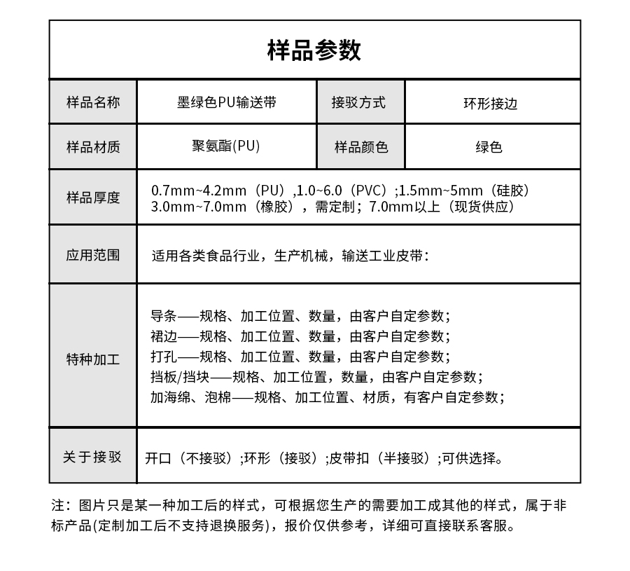 | 樣品名稱 | 墨綠色PU輸送帶 | 接駁方式 | 環(huán)形接邊 |