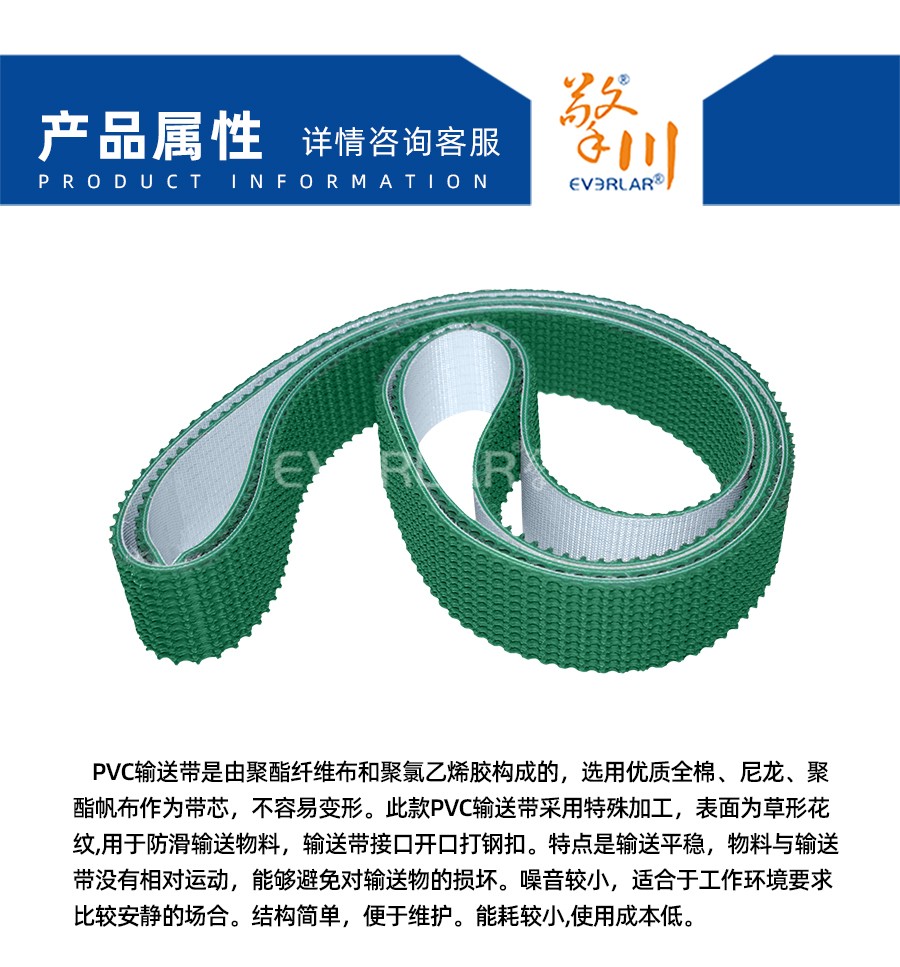 • 產(chǎn)品名稱:擎川everlar定制PVC輸送帶綠色花紋加鋼扣