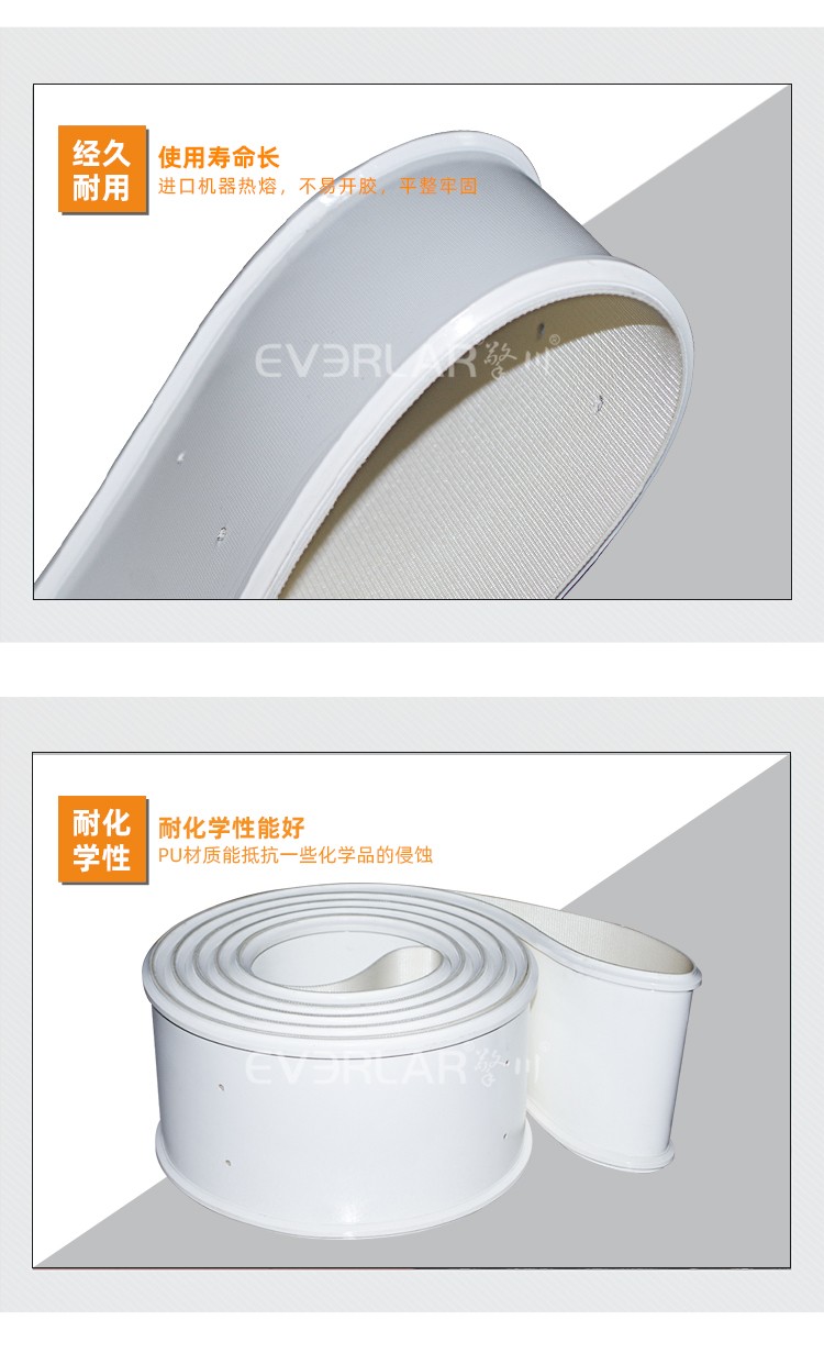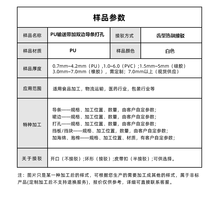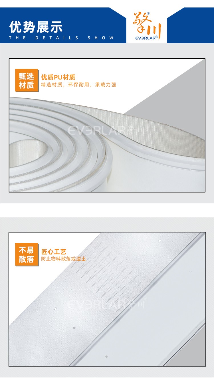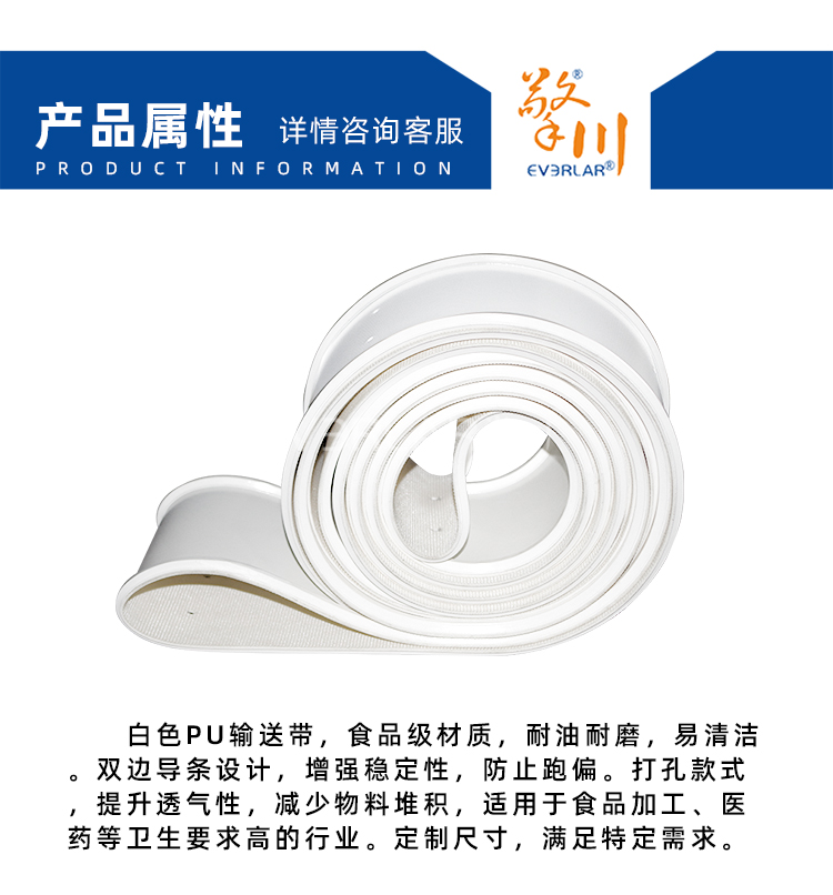 產(chǎn)品名稱:白色PU輸送帶加雙邊導(dǎo)條打孔耐磨耐油抗拉力強(qiáng)工業(yè)皮帶